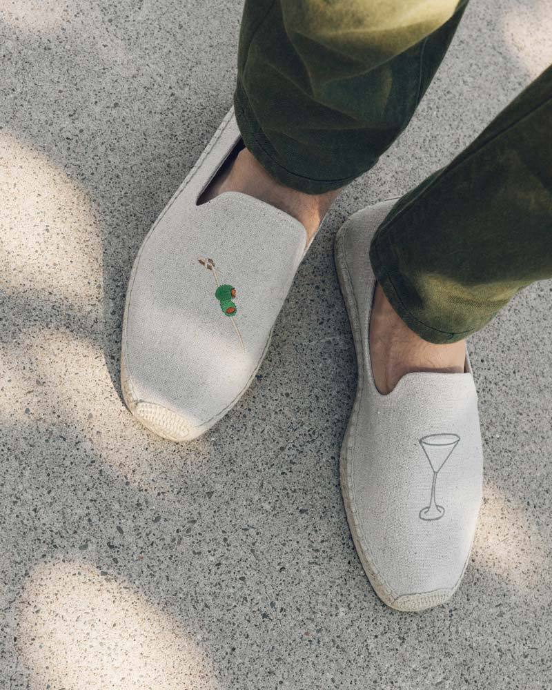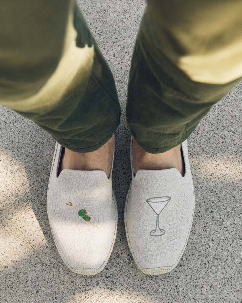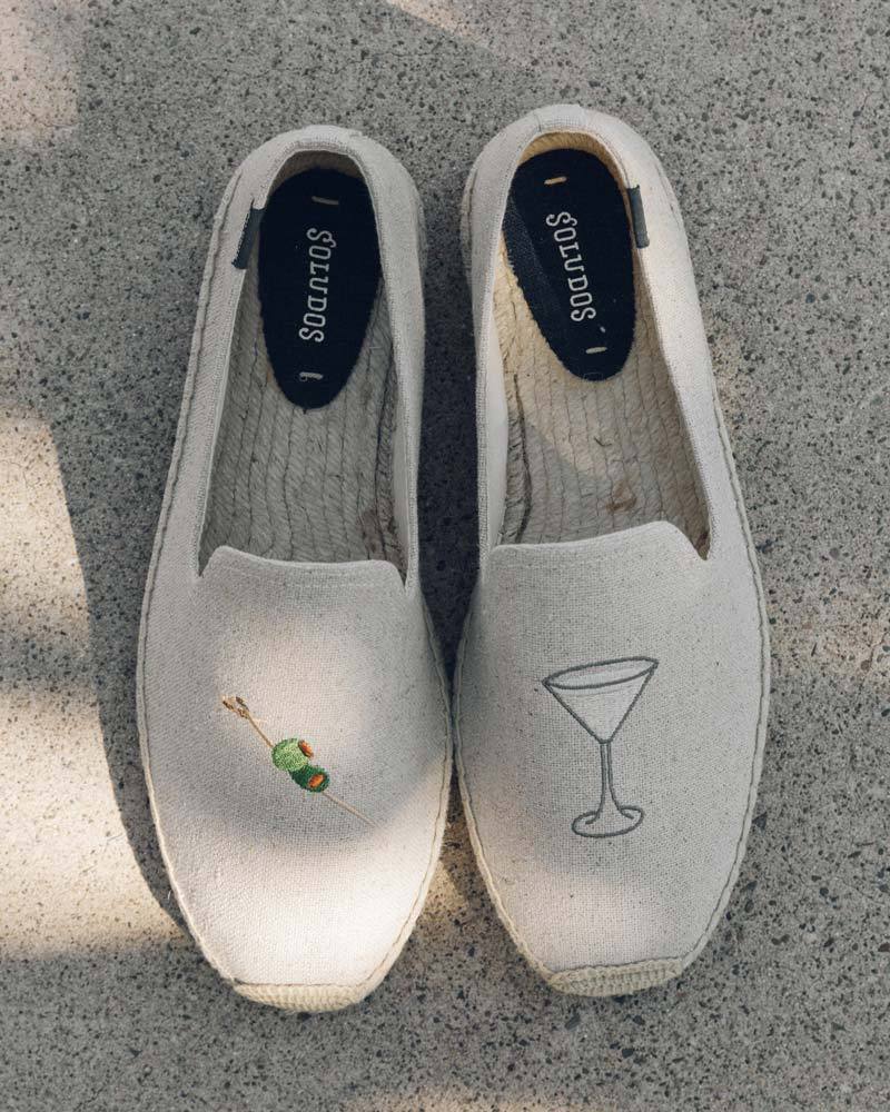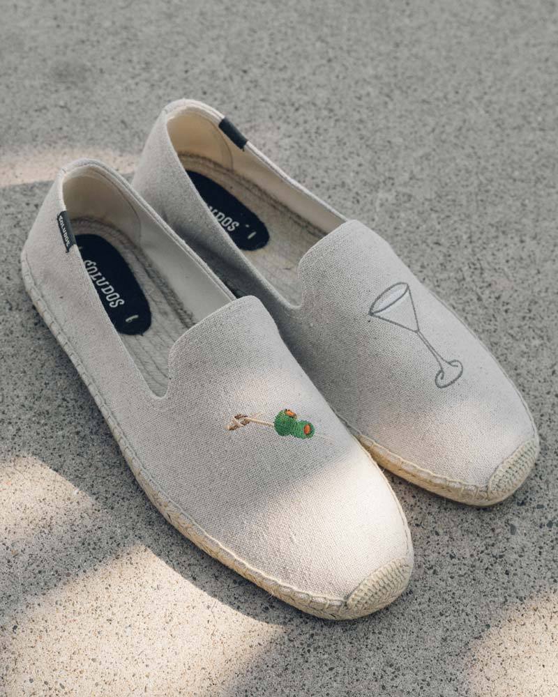 With their stone washed cotton canvas and sun-faded quality reminiscent of the Mediterranean, these smoking slipper espadrilles are a casual classic with a laid-back vibe. Plus, they feature our cocktail of choice, a martini, embroidered on the front.