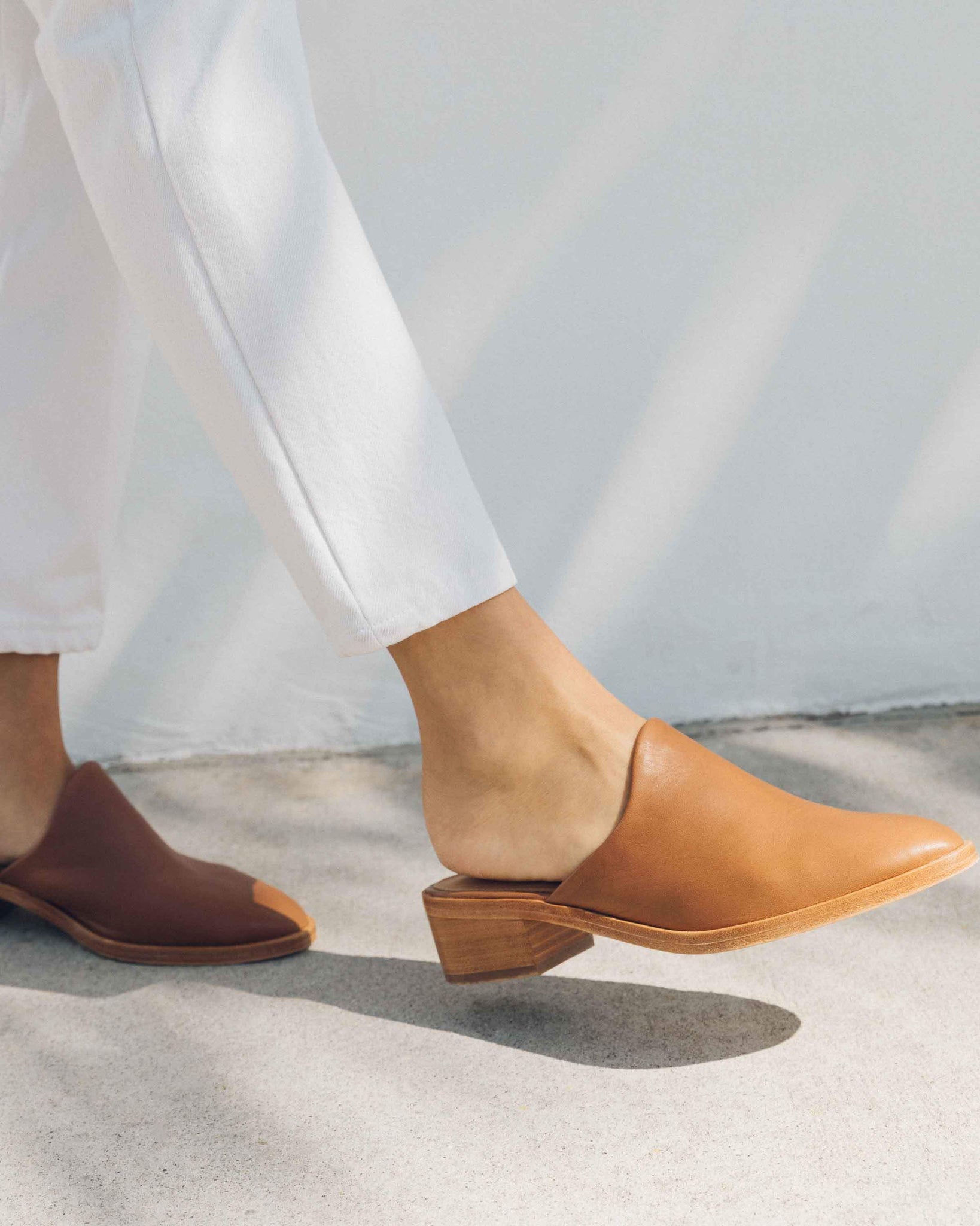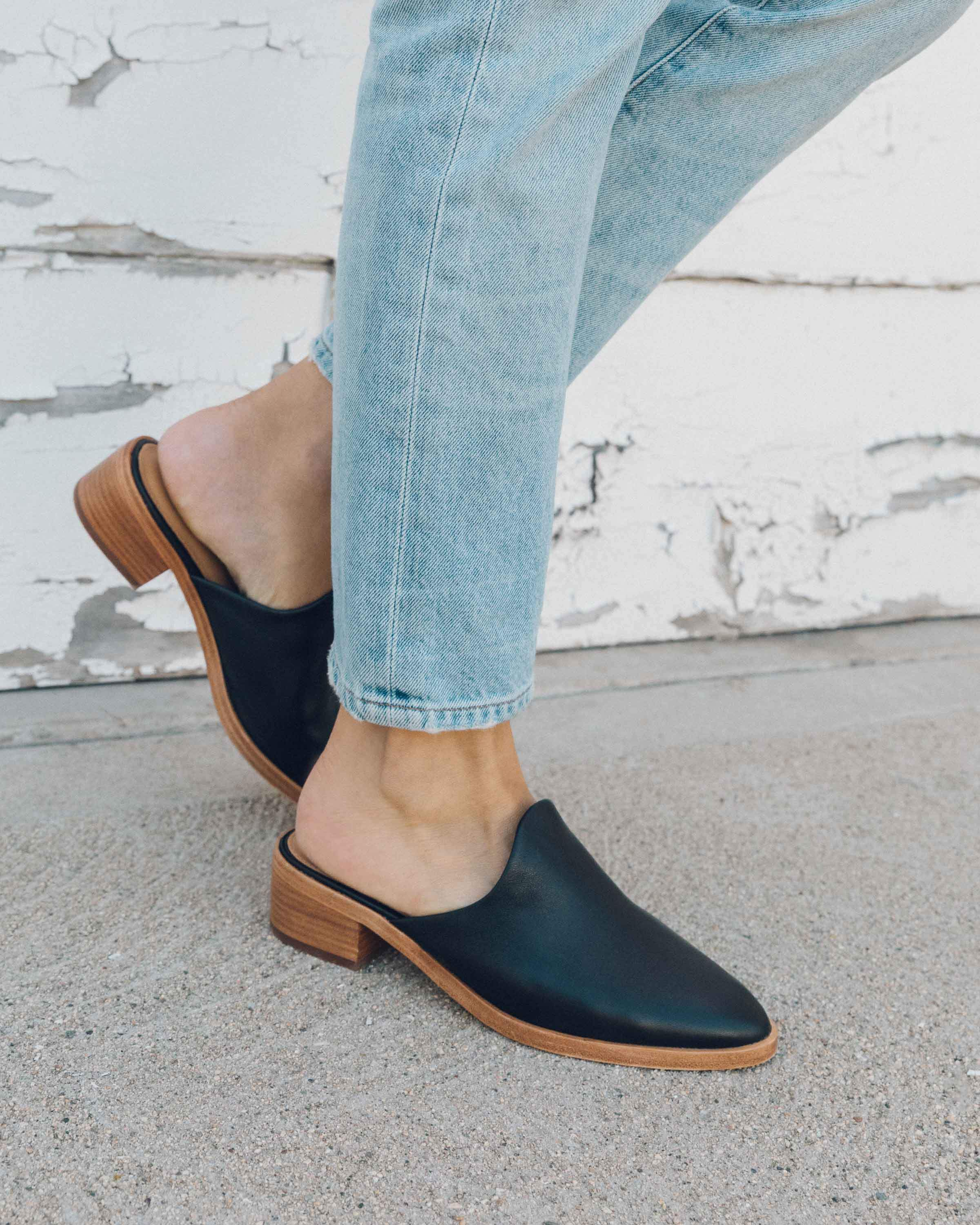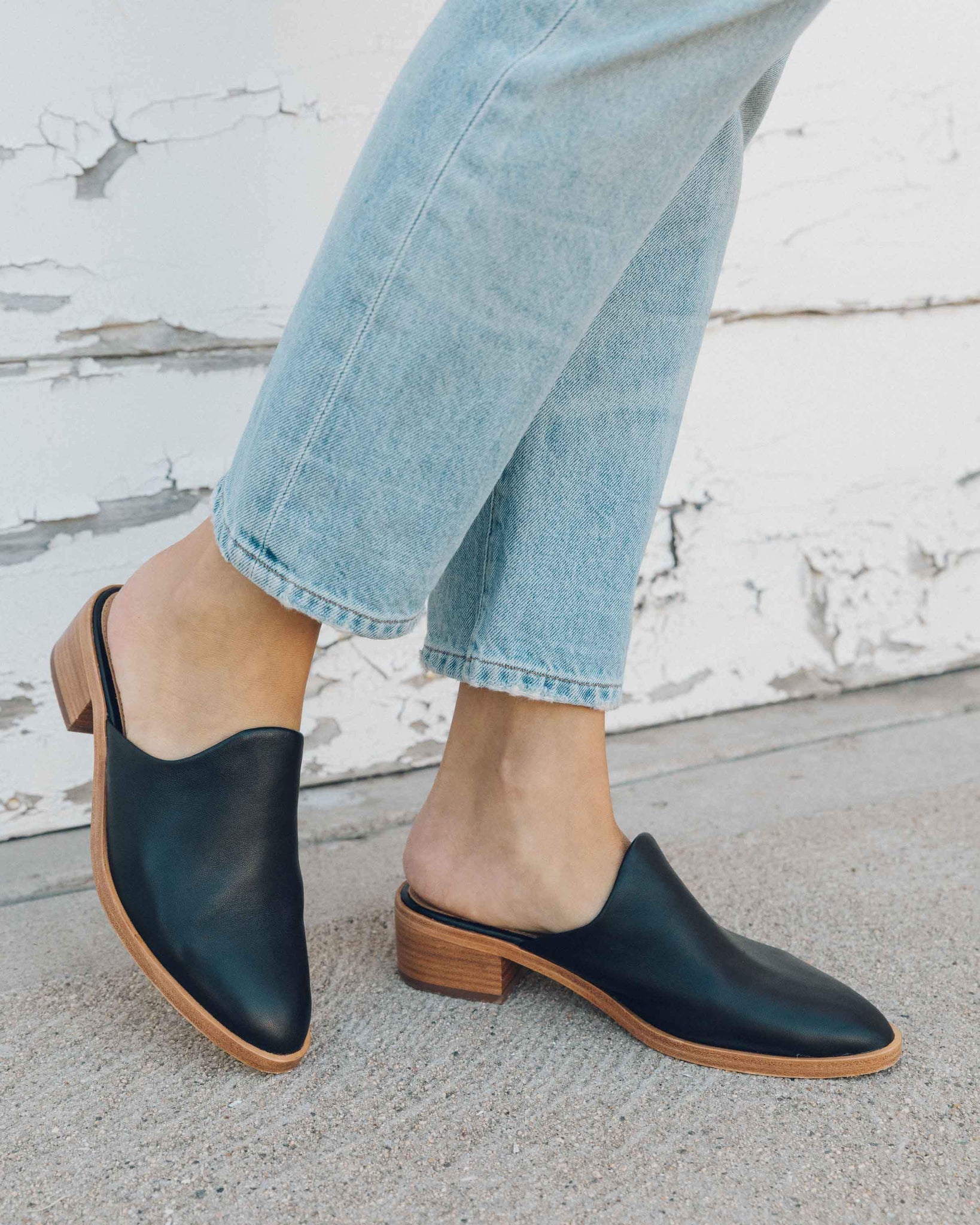The ultimate transitional shoe, the mule, with an artful topline (our designer looked at the wave graphic on our shoeboxes and mirrored it in the upper). Bonus: The stacked heel makes it supremely walkable.